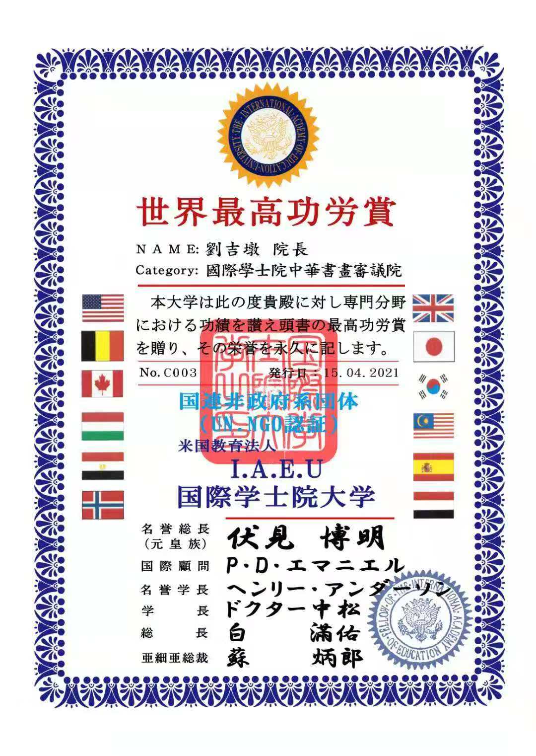 书画艺术大师刘吉墩荣受国际博士暨教授头衔